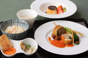 岩手県産彩菜鶏のバロティーヌ~トマトビネガーソース~/鯵のエスカベッシュ/人参のフムス/大船渡産イサダと筍 雫石産銀河のしずくピラフ/プリン・ア・ラ・モード/コーヒー